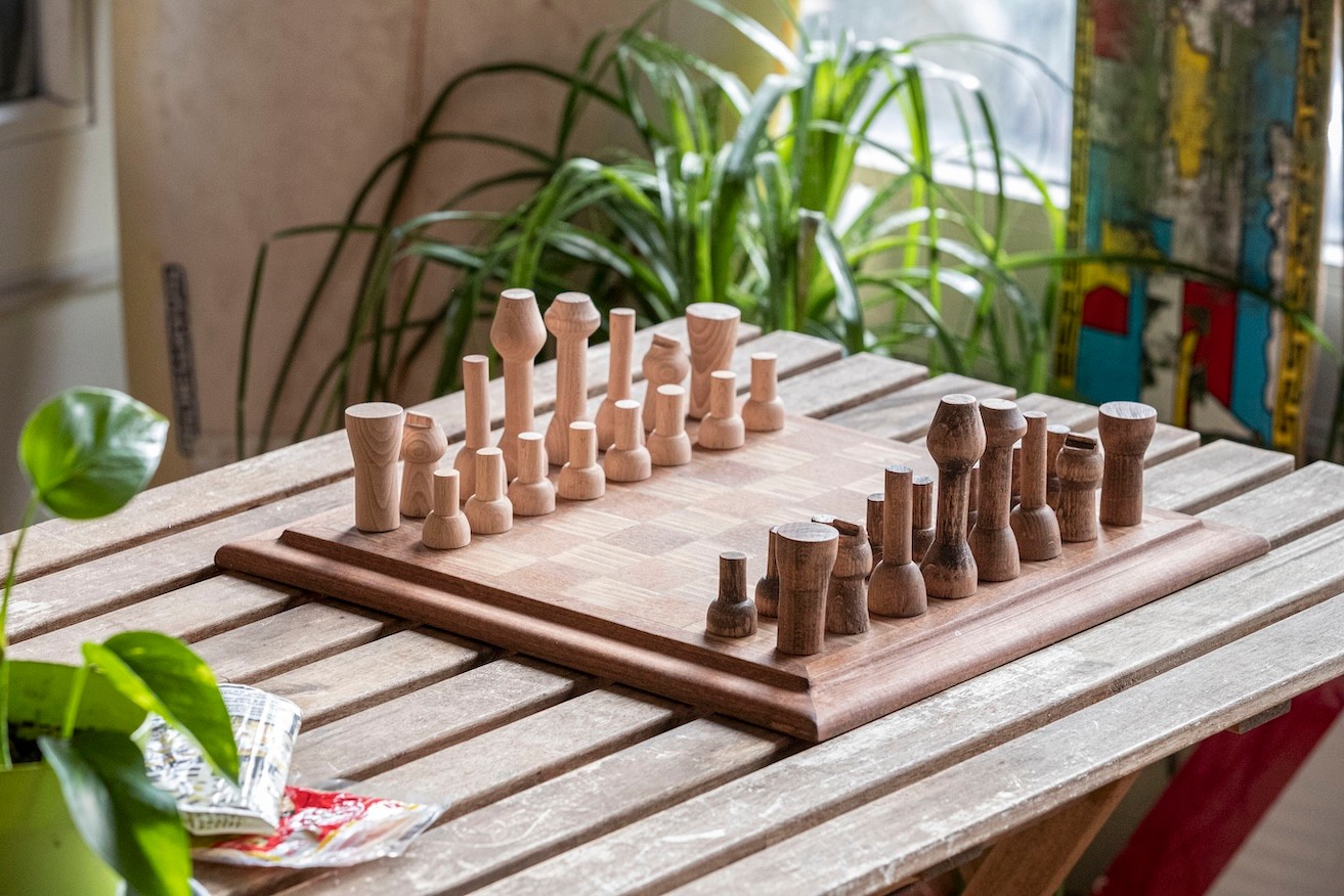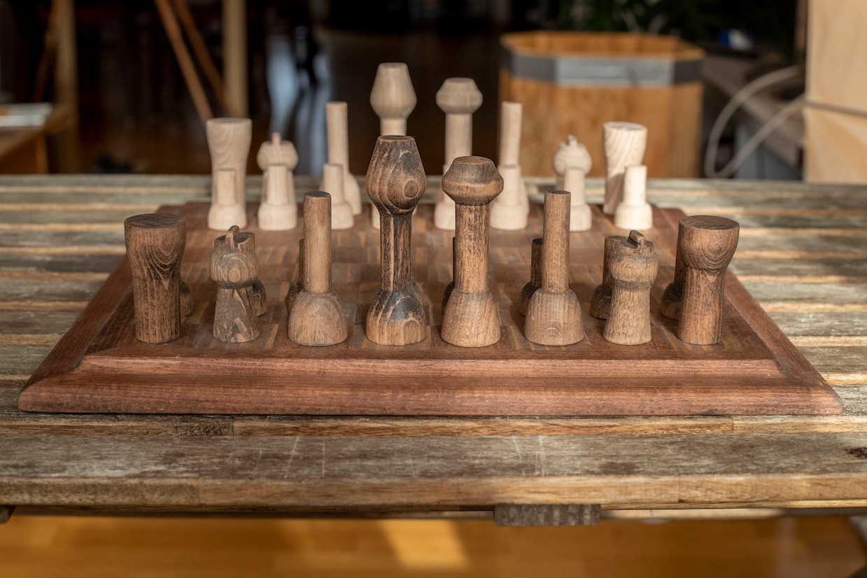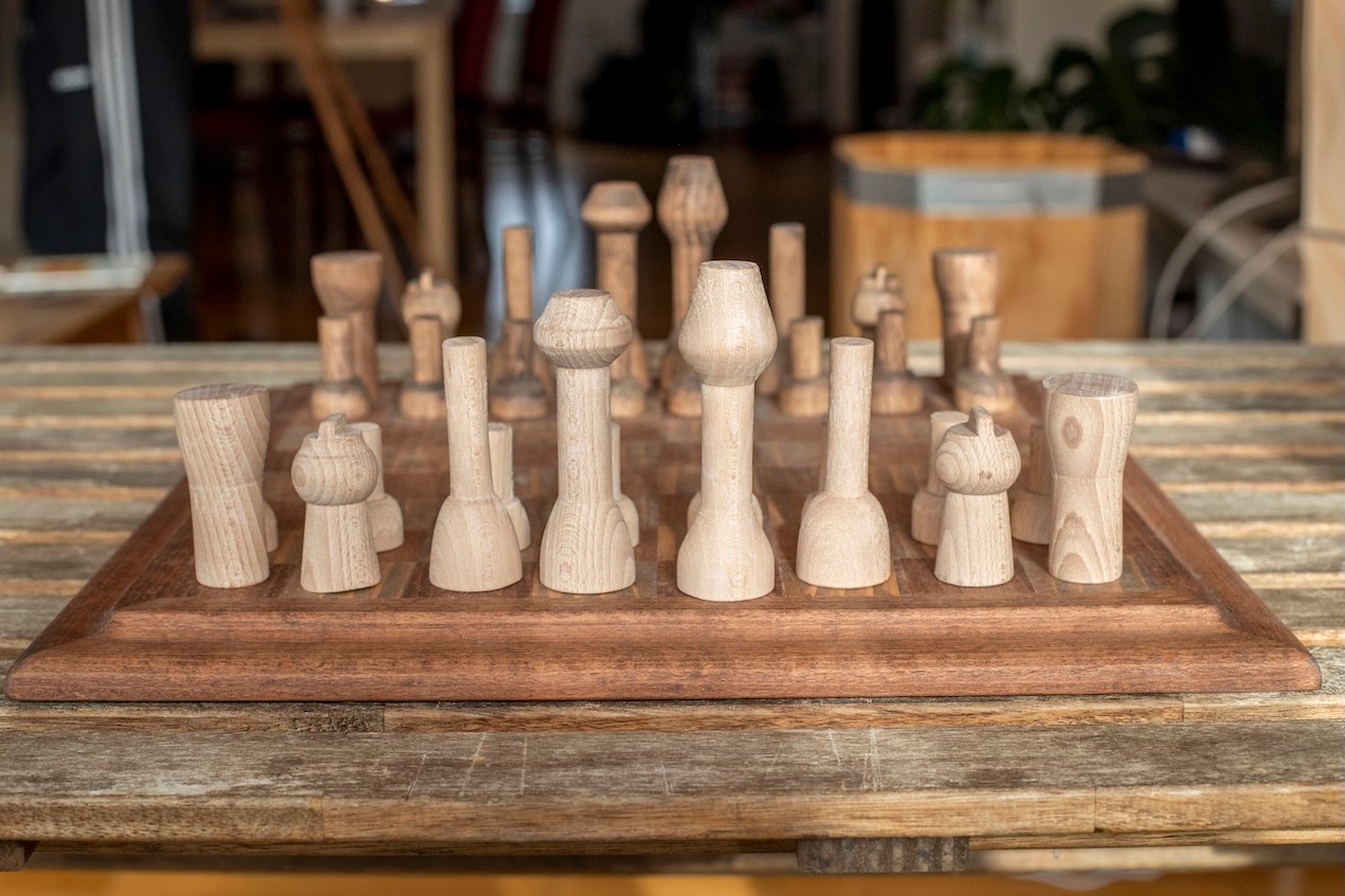 Entstanden ist ein vollständig handgefertigtes Schachspiel mit gestalterisch und formal aufeinander abgestimmten Elementen.