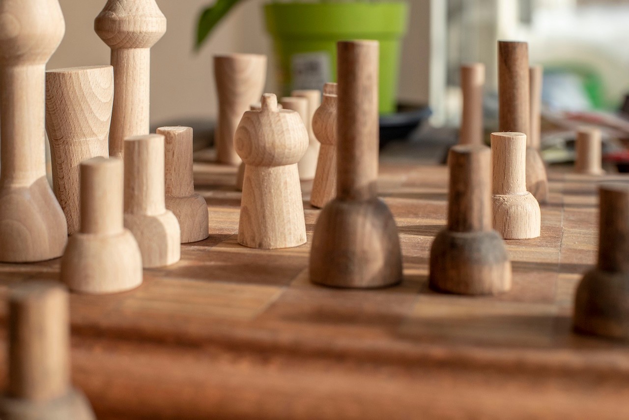 Ein individuell gefertigtes Schachbrett mit handgedrechselten Figuren – gestaltet mit Liebe zum Detail, umgesetzt mit traditionellen Holztechniken und einer klaren gestalterischen Linie.